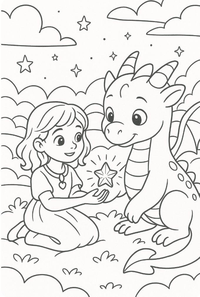 Éléonore serra le médaillon contre son cœur. Aussitôt, une douce lumière l’enveloppa, et elle sentit son corps devenir aussi léger qu’un nuage. En un clin d’œil, elle flotta jusqu’à passer… à l’intérieur du rêve du dragon. Il était fait d’un ciel rose et or, de montagnes de sucre filé, et d’une vallée dans laquelle le même dragon, beaucoup plus petit, semblait, lui, l’attendre, bien éveillé.