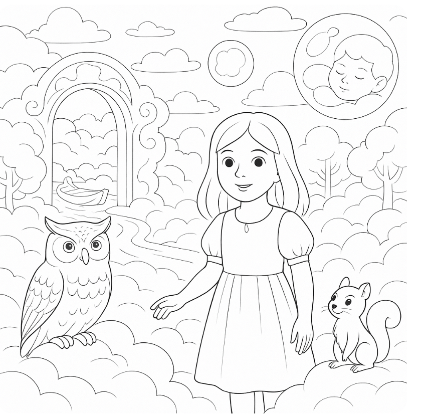 Elle parvint enfin au seuil de l’île, devant une grande porte sculptée dans la brume. Un hibou majestueux, aux plumes d’argent et aux yeux pétillants, l’accueillit d’une voix grave.